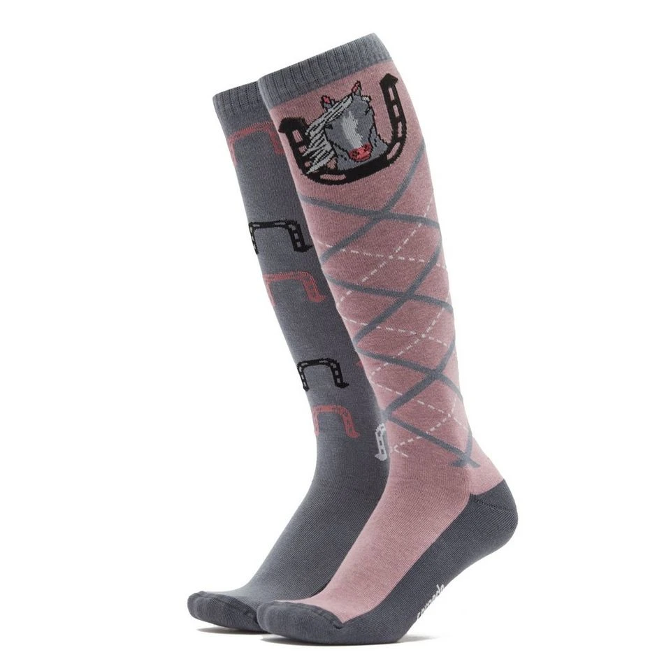 A pair of novelty adult riding socks with a horseshoe design.